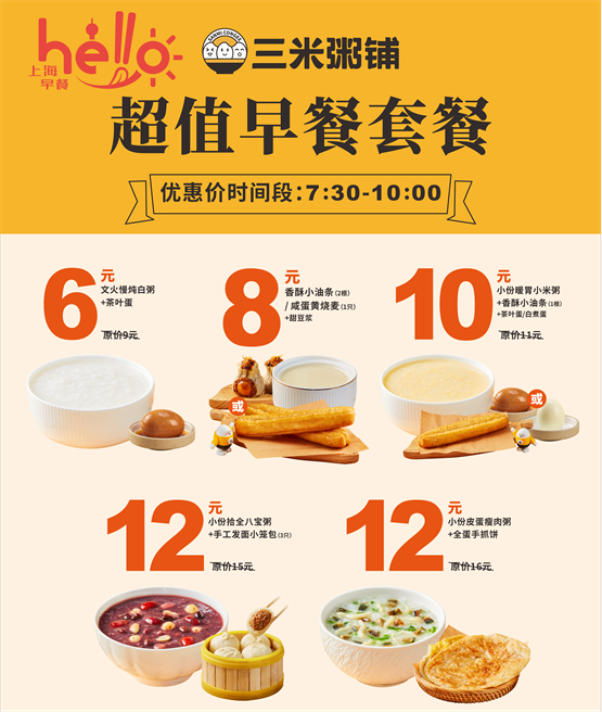 本次三米粥铺参与“早餐工程”的两家活动门店,每天特别供应5款“超值营养”的中式早餐套餐,推出以皮蛋瘦肉粥、小米粥为主的“粥+小吃”组合形式早餐,在保证营养健康的前提下,提供多种价位超值早餐,多方位覆盖不同层次消费人群。